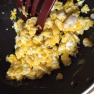 ・フライパンにオリーブオイル少々をあたため、たまご2個を割り入れ、塩麹も入れてはしでくるくる混ぜて、いり卵を作り、お皿に取っておく。