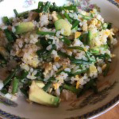 ・改めてフライパンにオリーブオイルを熱し、ニラ、アボカドを炒め冷やしご飯も入れて、塩麹、しょう油を入れてパラパラと